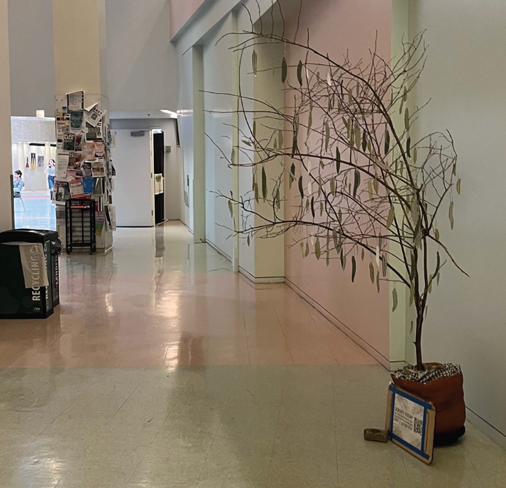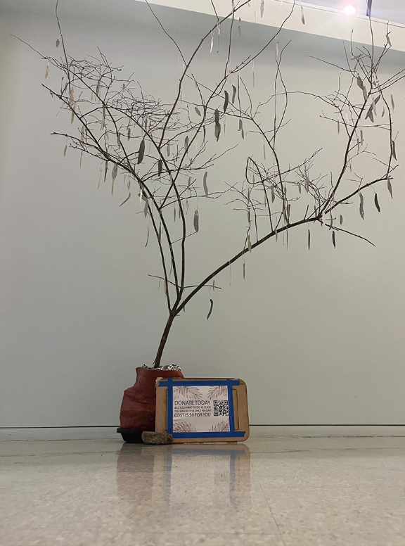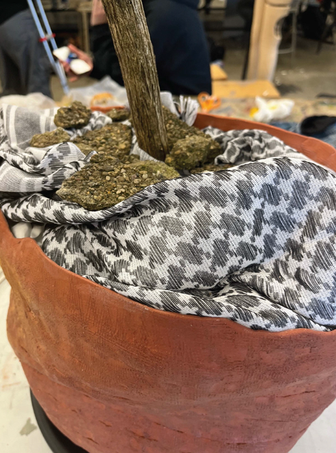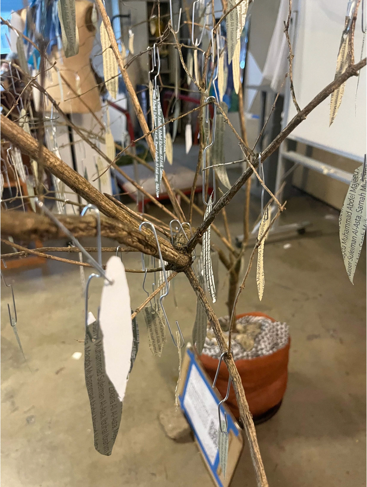 Honeysuckle Branch, Paper, Clay, Keffiyeh, Paperclips, Names of those lost in Gaza.