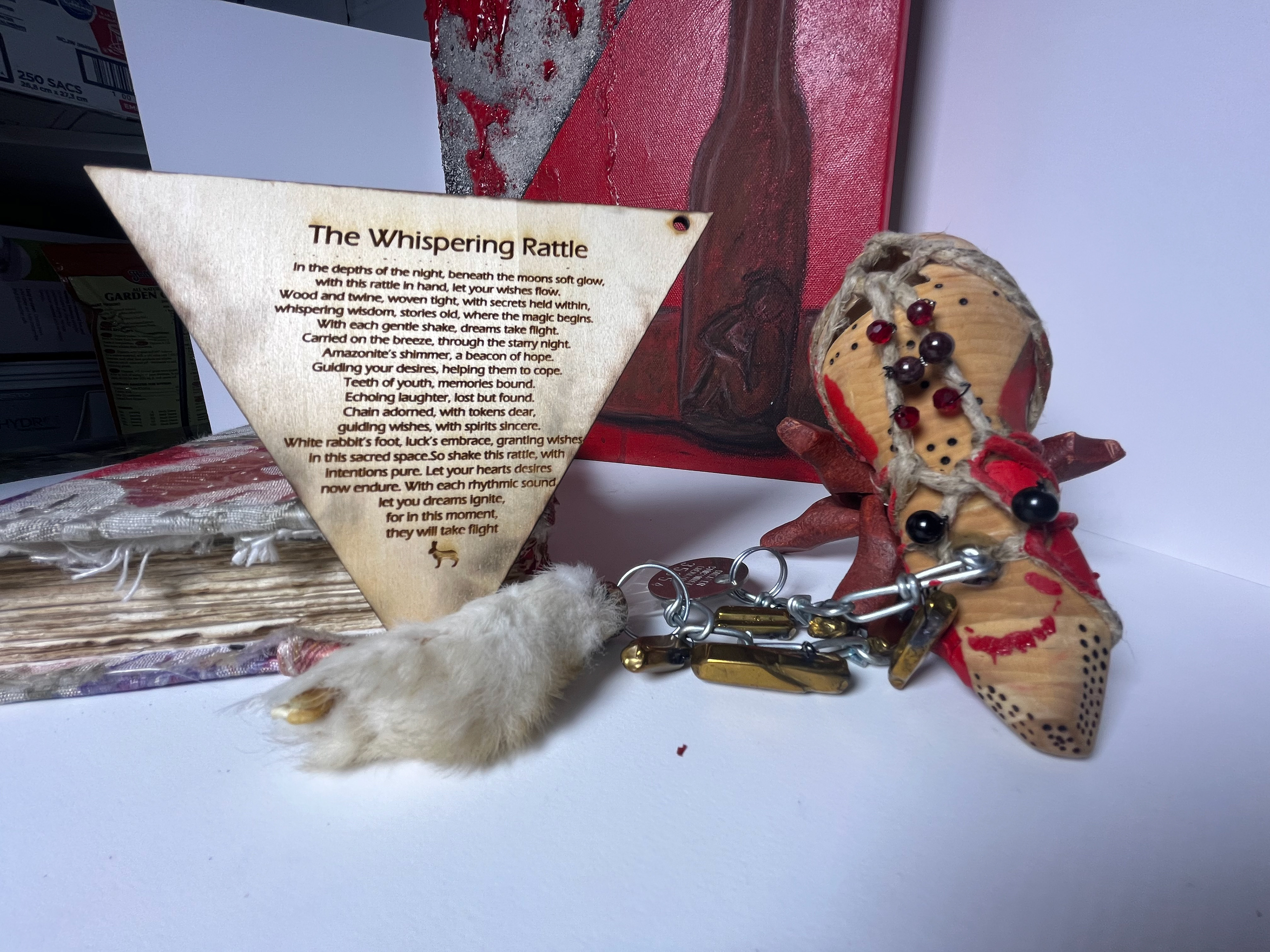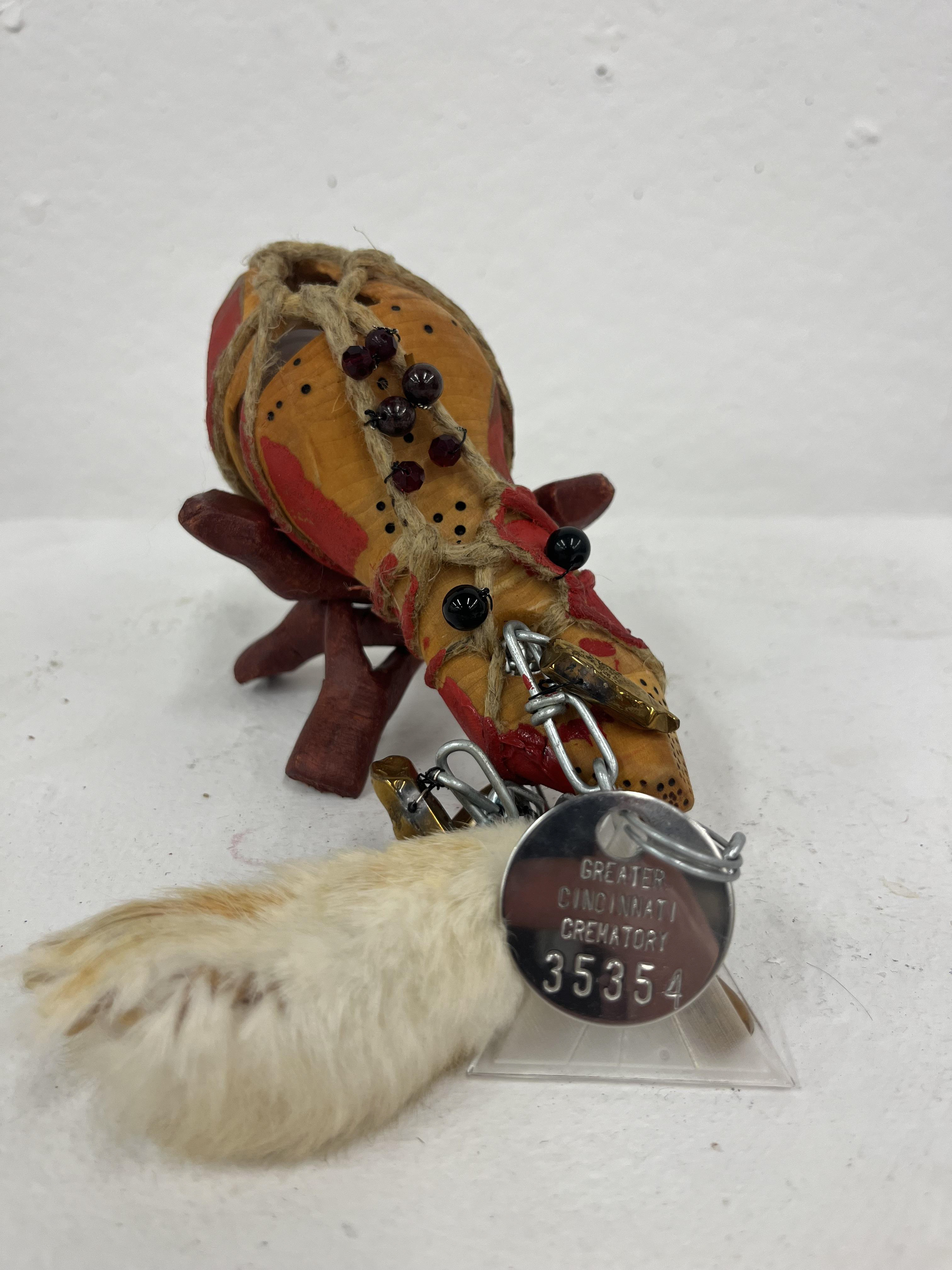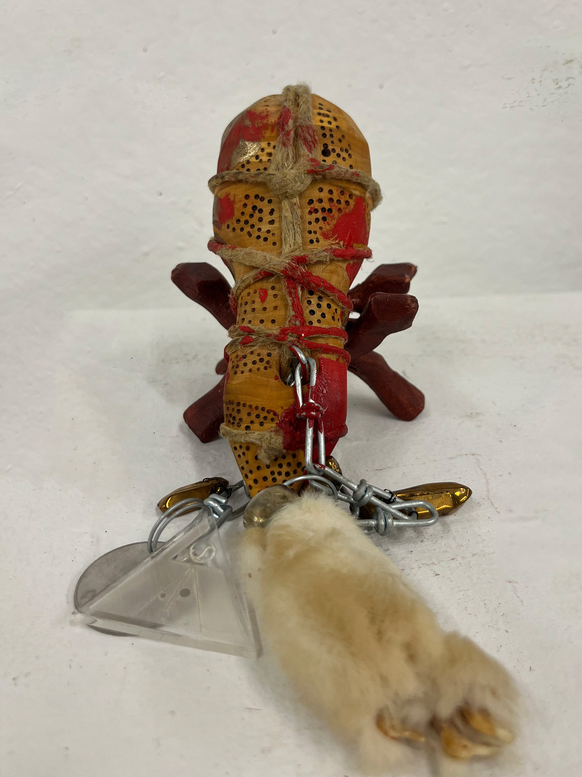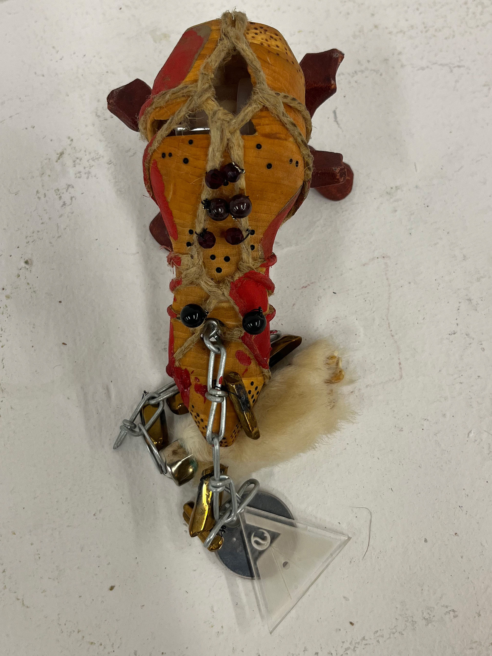 Bass Wood, Acrylic Paint, Twine, Garnet, Obsidian, Gold Plated Quartz, Amazonite, Teeth, Rabbits Foot, Crematory Tag, Chain, Acrylic